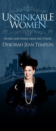 Based on actual diaries, letters and interviews, Unsinkable Women brings to life nine famous figures including Madeline Astor (the beautiful teenage bride of John Jacob Astor, one of the wealthiest men in America) and Margaret Tobin Brown- the Unsinkable Molly" herself - whose account of the Titanic's final moments brings the evening to its dramatic climax.  Characters who share their stories of tragedy and triumph include stewardess Violet Jessop (who tells of the friendships and loves of the below-decks serving crew) and Nora, an English music hall performer on her way to New York to appear in American vaudeville.  With musical underscoring and accompaniment on compact disc created by musical director C. Colby Sachs, choreography by Broadway veteran Ron Schwinn, nine sumptuous period costumes designed by Sara Jablon and direction by Nancy Robillard  Unsinkable Women offers vivid portrayals, punctuated with period songs from vaudeville numbers to Victor Herbert's "Toyland". Drawing wigs, costume and props from an authentic 1912 wardrobe truck while on stage, Ms. Templin transforms herself, shifting from character to character in full view of the audience.  Internationally acclaimed as a remarkable tour-de-force, Unsinkable Women has been called "the most affecting and truthful version of the Titanic story to day."